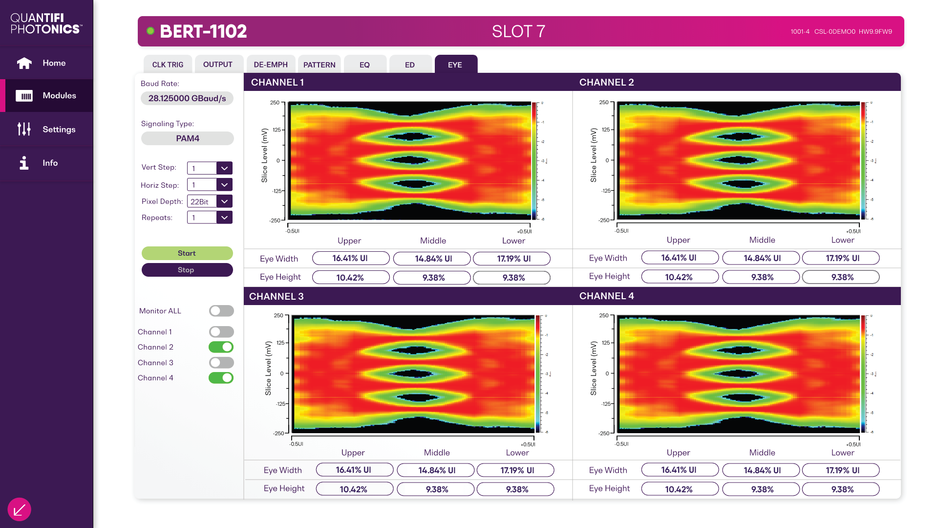 PXI中極高的通道密度--每個兩槽PXIe模塊支持多達8個通道,單個PXIe機箱可容納多達64個同步的29 Gbaud通道(每個通道支持NRZ或PAM4)。