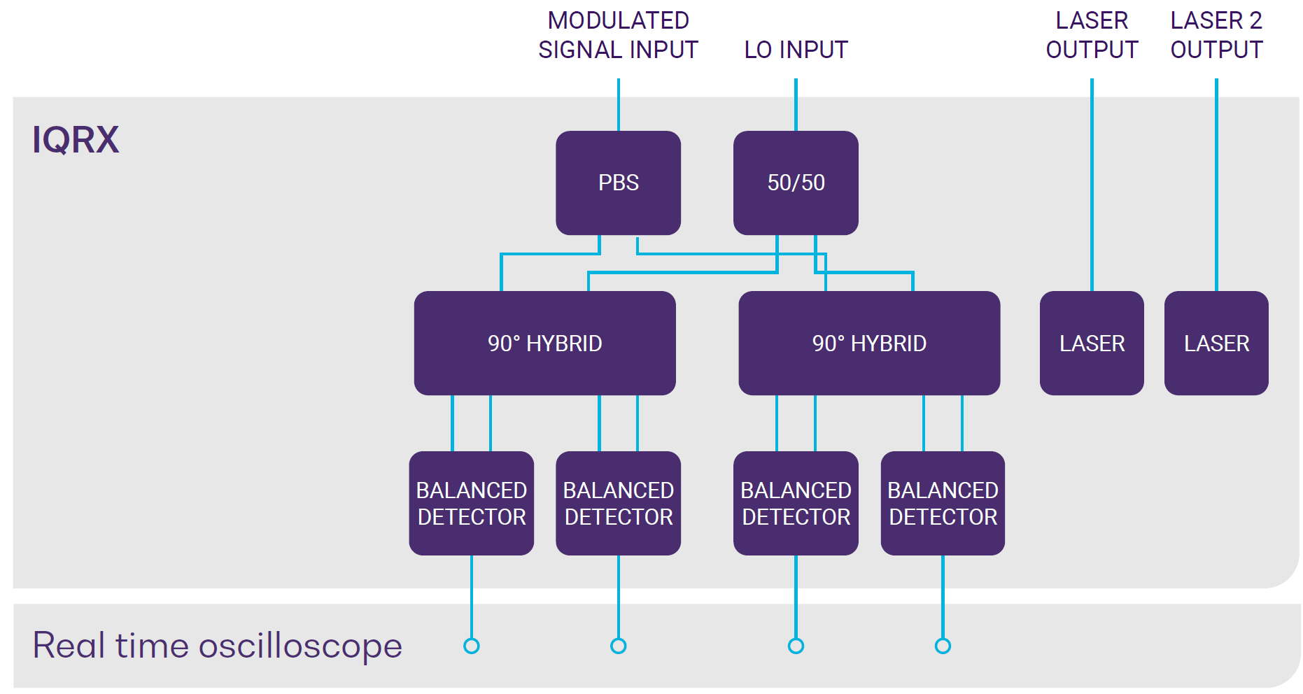 IQRX 采用頂級分立光纖器件設計制造,可高保真度測量相干調(diào)制信號。為最大限度降低噪聲,IQRX 未使用商業(yè) ICR 中常見的跨阻放大器(TIA)。