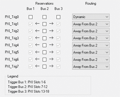 每個(gè)槽位都可以創(chuàng)建觸發(fā)信號(hào),并且觸發(fā)事件可以通過(guò)每個(gè)PXI觸發(fā)線傳輸。通過(guò)NI MAX軟件界面為PXIe機(jī)箱配置觸發(fā)線非常簡(jiǎn)單。