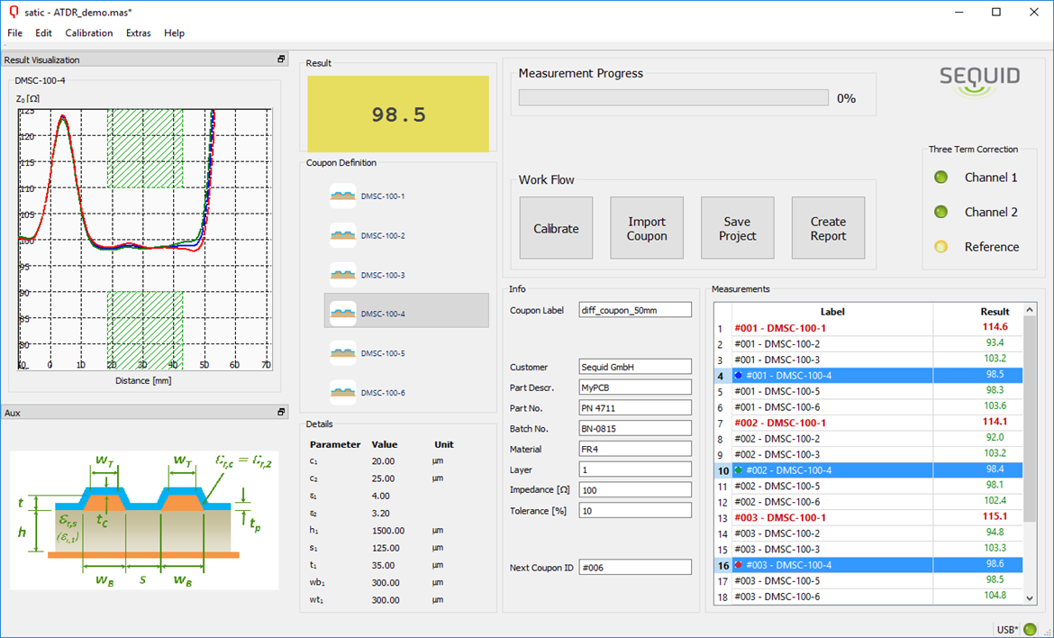 Sequid ATDR100是自動(dòng)化阻抗測試設(shè)備,通過高頻階躍信號應(yīng)用到Coupon和PCB上。通過高性能多路復(fù)用器及彈簧加載的探針測試多達(dá)16個(gè)通道的傳輸線路。Coupon的設(shè)置(傳輸線類型、目標(biāo)阻抗、公差)通過可以運(yùn)行每個(gè)coupon的測試程序自動(dòng)組成,將測量周期減小到僅幾秒。通過自帶的coupon生成器可以輕松生成測試程序及Gerber生產(chǎn)文件。
